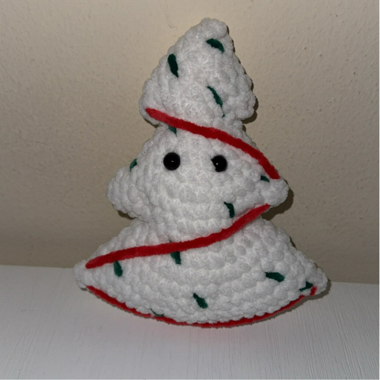 The second design, inspired by the beloved Little Debbie Christmas Tree cake, offers a sweet and nostalgic twist. Crocheted in creamy white yarn with the signature wavy red stripes and dotted “sprinkles,” this tree captures the playful spirit of the iconic treat. Its fluffy, cake-like appearance brings a touch of whimsy and is sure to spark smiles and memories.