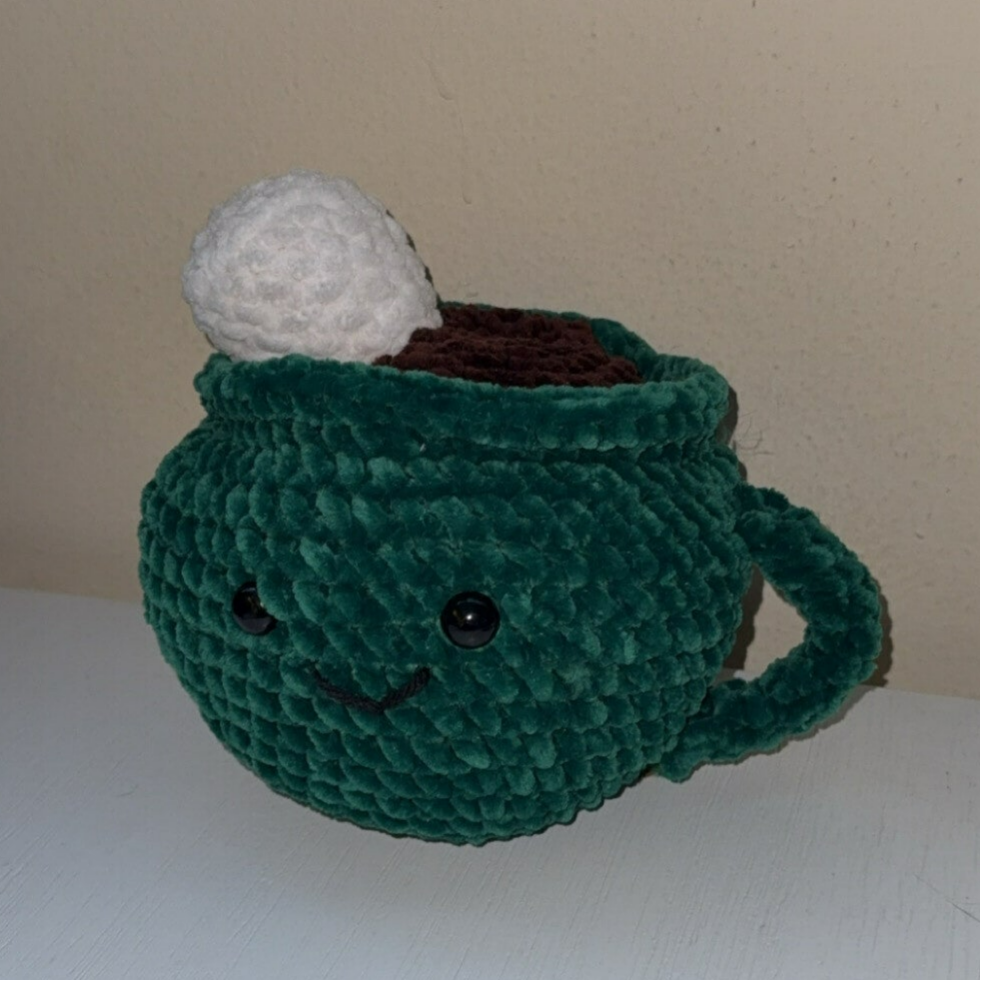 This adorable green crocheted hot cocoa mug is the perfect blend of warmth and whimsy. Crafted with soft, vibrant green yarn, the mug features a sturdy handle and a gently rounded shape that gives it a plush, comforting feel. The top is finished with a rich “hot cocoa” brown, accented by fluffy white crocheted marshmallows that peek over the rim for an extra-sweet touch. Whether used as a festive decoration, a cute addition to a tiered tray, or a charming handmade gift, this cozy crochet creation brings a delightful touch of winter warmth to any space.